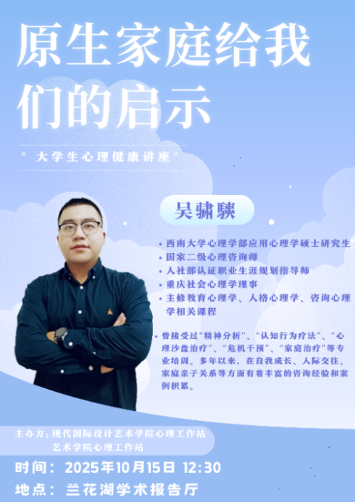 2025年10月15日,欢迎光临888集团网站心理工作站和艺术学院心理工作站联和主办的“原生家庭给我们的启示” 大学生心理健康讲座在兰花湖学术报告厅成功举办。讲座邀请到大学生心理健康教育与咨询中心吴骕騻老师主讲,两院心理专项老师、心理委员、寝室室长参加了此次讲座。